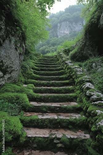 Stone steps covered in moss ascend through a lush green forest environment.