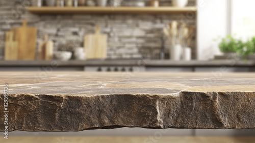 Stone tabletop with kitchen interior background ideal for showcasing products or culinary displays in a stylish setting.