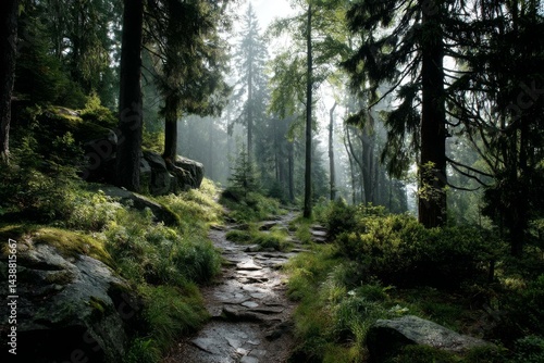 Stone trail through misty woodland with towering coniferous evergreen trees and dense green undergrowth creating nature scene