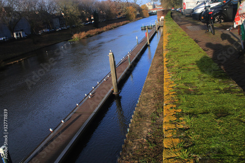 Stone wall, covered in moss, made next to the river to protect the city from outsiders