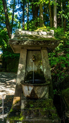 Stone water fountain in a lush forest