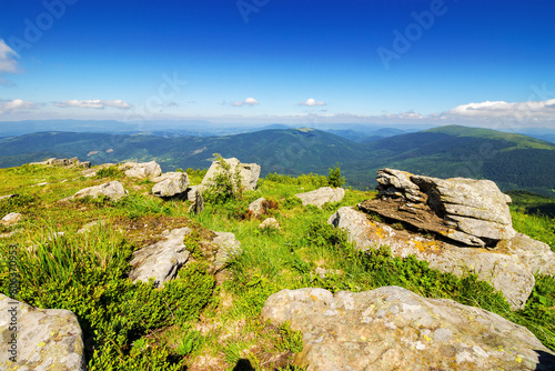 stones among the grass on top of smooth polonina. alpine landscape of urainian carpathian mountains in summer