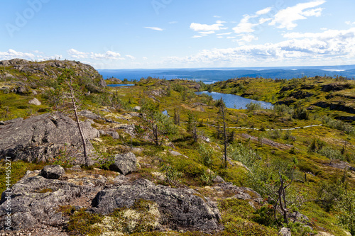 Stones, rocks and rare vegetation on the green mountain Kivakka, Paanayarvi. Karelia. Russia overlooks the blue ocean on the horizon. Exploration. Freedom to travel. Open to new horizon. Top of hill.