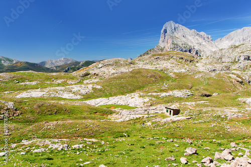 Stony track in mountains of Picos de Europa and tourists, the vicinity of Fuente De