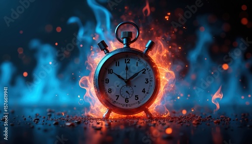 Stopwatch burns intensely with blue and red flames. This illustration signifies urgency, deadlines, and rapid project completion. Ideal for concepts of speed, time management, and launch countdowns.