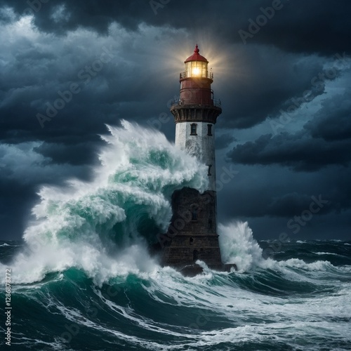 Stormy Ocean with a Lighthouse – A dramatic scene of a massive ocean storm, with a single lighthouse standing strong against giant waves.