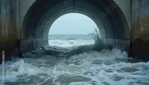 Stormy weather drives floodwaters through concrete drainage culvert towards the ocean. Waves crash against structure, highlighting water management and coastal protection systems in action.