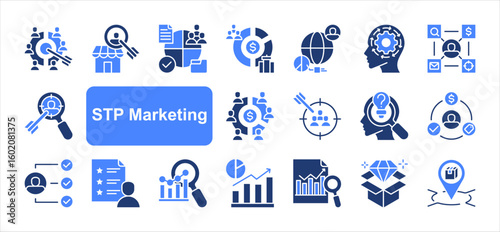 STP Marketing editable stroke icon set, with Segmentation, Target market, Buyer persona, Demographic, Psychographics, Market positioning, Value proposition