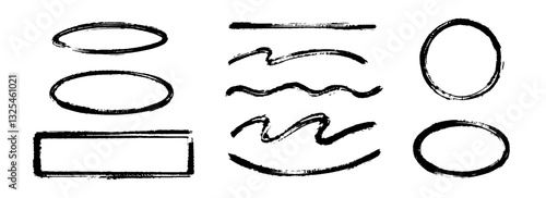 Straight and wavy paint line set. Sketch brush stroke and frames collection. Rough charcoal stripes and forms for highlight, underline, emphasis. Vector hand drawn textured crayon chalk elements