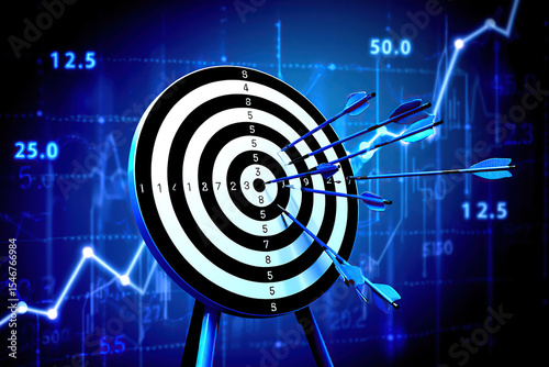 Strategic Arrows Hitting Bullseye on Target Board with Financial Data Visualization Demonstrating Precision and Accuracy in Achieving Business Objectives and Investment Success in a Competitive Market