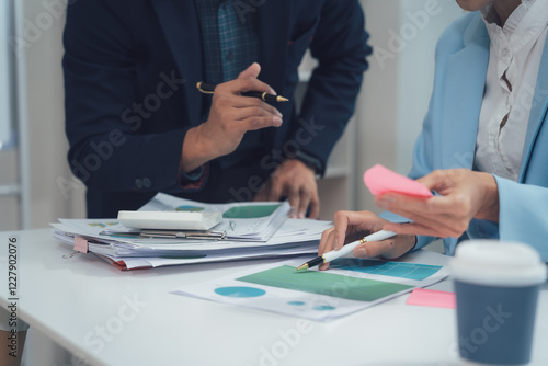 Strategic Collaboration: Two business professionals collaborate on a project, focused on a detailed document and using sticky notes.