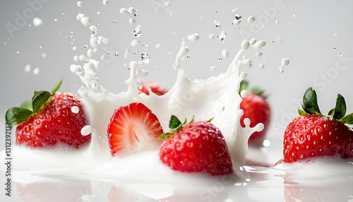 Strawberries and splashes of milk or yogurt in the air on a white background