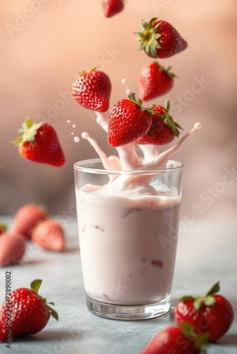 Strawberries dropping into a glass of pink liquid, creating a splash, surrounded by scattered berries.