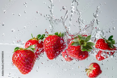 strawberries in flight fall into water, splashes of water, white background, food levitation
