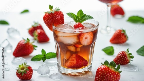 Strawberry cocktail in glass with ice and fresh strawberries garnished with mint leaves on white background with copy space
