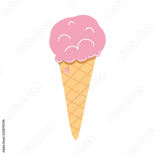 Strawberry ice cream in waffle cone. Summer dessert. Vector illustration of ice cream. Melting ice cream.