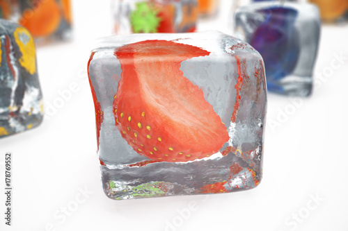 Strawberry in ice cube isolated on white with depth of field effects. Ice cubes with fresh berries. Berries fruits frozen in ice cubes, 3D rendering
