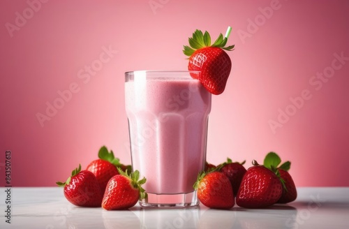Strawberry milkshake in a transparent faceted glass, decorated with strawberries on a pink background