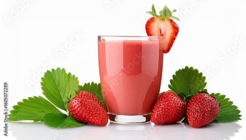 strawberry smoothie isolated on transparent background with fresh fruit and green leaf