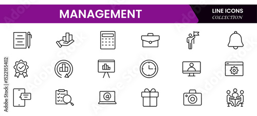 Streamlined vector web line icons showcasing management concepts, leadership, teamwork, organization, strategy, and efficient business operations.