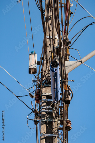 Street light pole with a tangle of wires and the blue sky in the background of the image