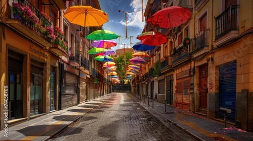 street scene, whimsically adorned with a canopy of colorful umbrellas, creating a vibrant and playful atmosphere