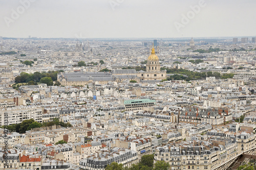 Streets of Paris from the height of the Eiffel Tower. Seine River. Rooftops of Parisian houses.