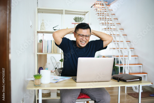 Stressed Asian man looking at laptop with disappointment expression while working at home
