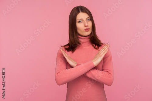 Strict bossy woman with brown hair in pink sweater showing x sign with hands, there is no way more, hopelessness. Indoor studio shot isolated on pink background