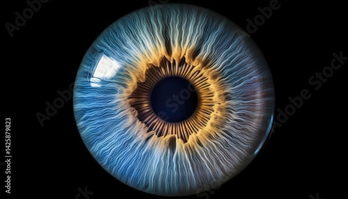Striking Macro Photography Black Background Highlights Intricate Eye Iris Patterns in Vivid Detail, Revealing the Mesmerizing Depth of Human Iridescence.