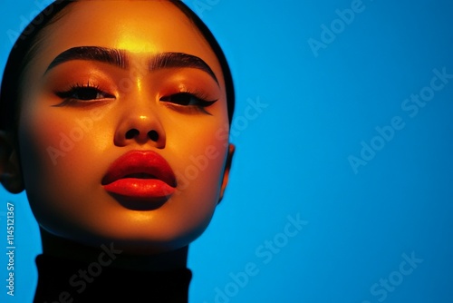 Striking minimalist portrait of a young woman with bold makeup and sharp features against a glowing cyan background creating a modern and futuristic artistic statement