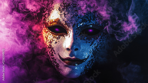 striking mosaic mask with dark eyes emerges from colorful smoke, creating mysterious and captivating atmosphere. intricate details and vibrant hues evoke sense of intrigue and allure