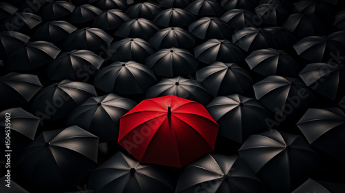 Striking Red Umbrella on Deep Black Background Highlighting Bold Color Contrast