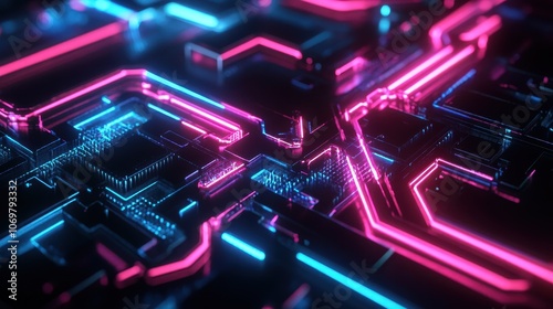 Striking visual features neon pink and blue lines intersecting on glossy black surfaces, symbolizing high-speed flow of data in digital network, illustrating advanced aspects of modern technology.