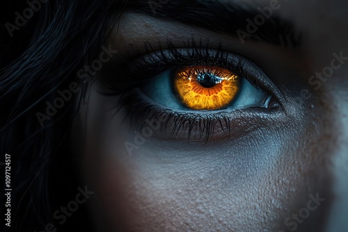 striking yellow eye gazing intensely, set against a dramatic dark background, emphasizing the depth and emotion within, creating an impactful focal point that captivates the viewer