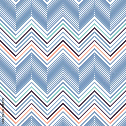 Striped Chevron Seamless Pattern. Vector Abstract Zigzag Colorful Wallpaper. Blue and Pink Pastel colors on White Background.