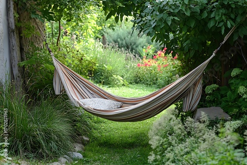 Striped Hammock with Pillow Hung in Greenery Garden on Bright Sunny Day