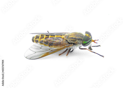 striped horse fly - Tabanus lineola - is a species of biting horse-fly. It is known from the eastern and southern United States and the Gulf coast of Mexico isolated on white background Side top view