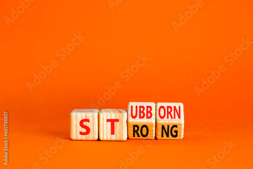 Strong and stubborn symbol. Concept words Strong Stubborn on wooden block. Beautiful orange table orange background. Business strong and stubborn concept. Copy space.