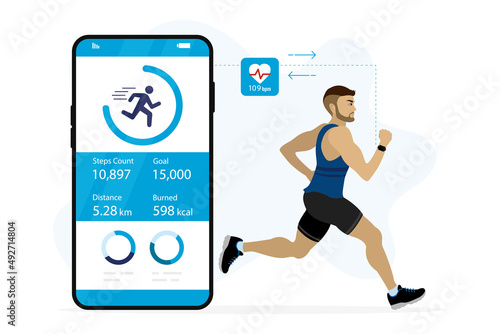 Strong man is jogging. Synchronization of mobile phone and smart watch, counting chances, calories and heart rate. Healthy lifestyle and new technologies. Cell Phone with icons