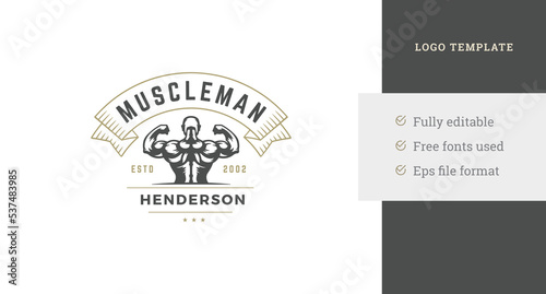 Strong muscular man back training sport fitness center logo design template place for text vector