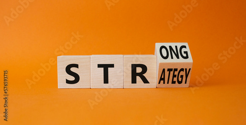 Strong Strategy symbol. Turned wooden cubes with words Strong Strategy. Beautiful orange background. Business and Strong Strategy concept. Copy space