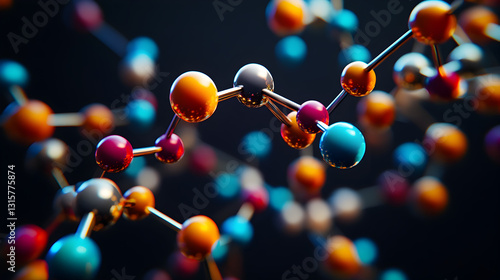 structure in motion with floating atoms in bright colors, connected by glowing bonds, set against a dark and high-tech scientific background