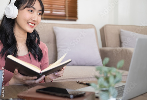 Student holding text book.Smiling asian girl wearing headphones using laptop, looking at screen, happy young female listening to music while working online. excited student learning language,