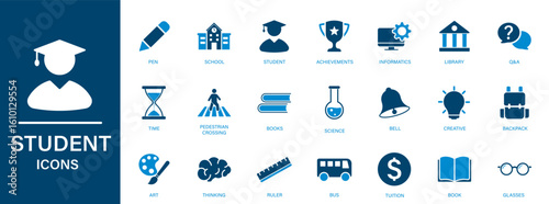 Student icon. Containing back to school, backpack, books, thinking, bus, science. Solid vector icon.