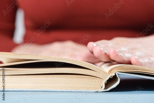 Student reading a book close up.