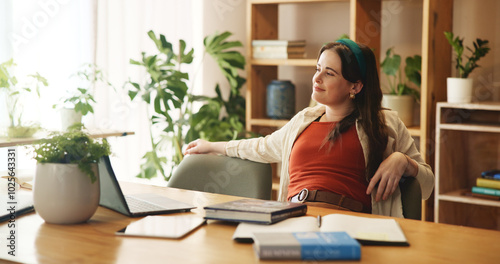 Student, smile and relax with girl in home office for research assignment, college thesis and satisfaction. Education, calm and learning with person studying for university, school and project