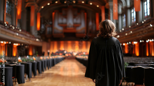 Student Walking Down Aisle at Ceremony from Rear Angle in Elegant Hall with Warm Lighting and Decorations