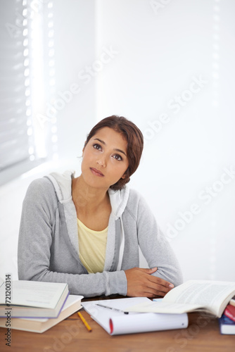 Student, woman and thinking with books for education, knowledge or study with idea and mock up in college..Young person, face and thoughtful at desk with novel for scholarship, project and assessment