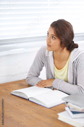 Student, woman and thinking with books for study, knowledge or education with idea for learning in bedroom. Young person, girl and thoughtful at desk with novel for scholarship, project or assessment